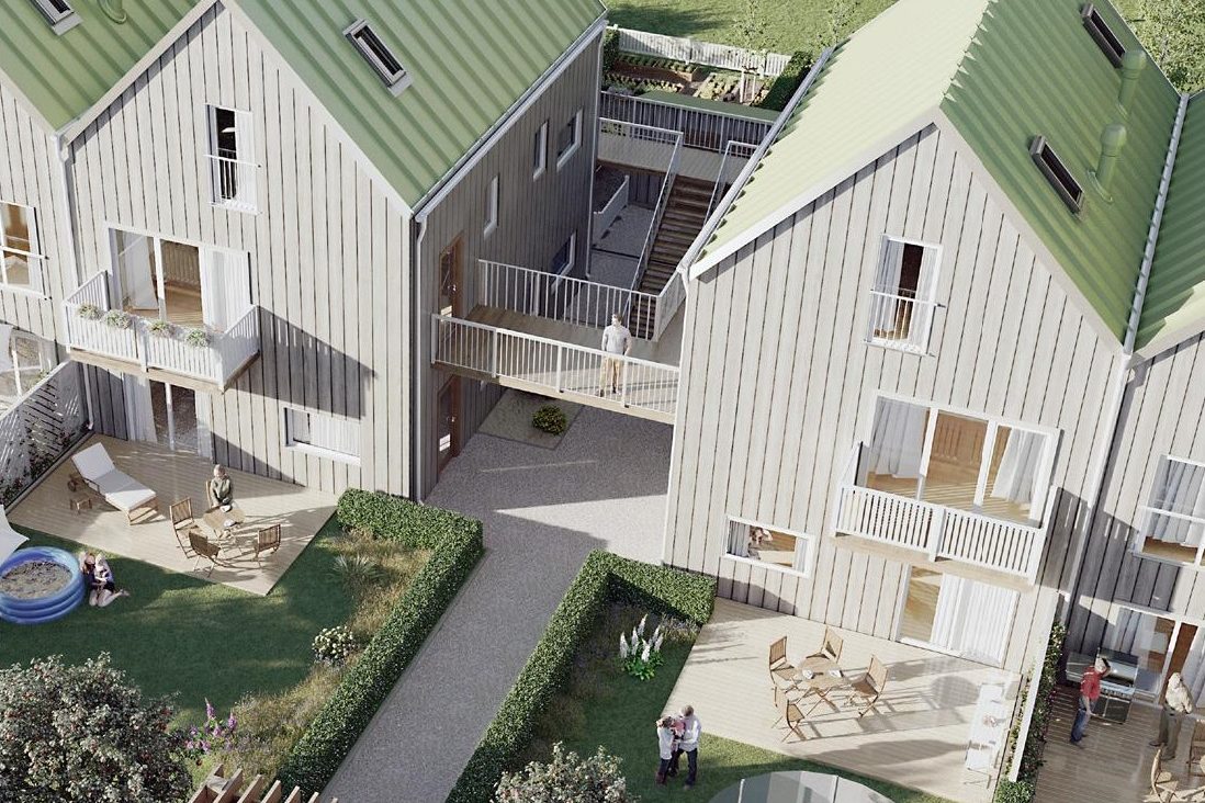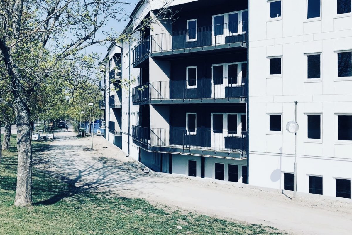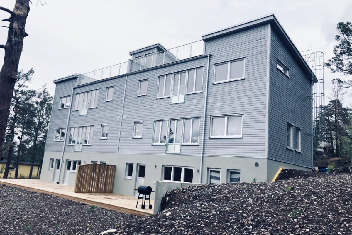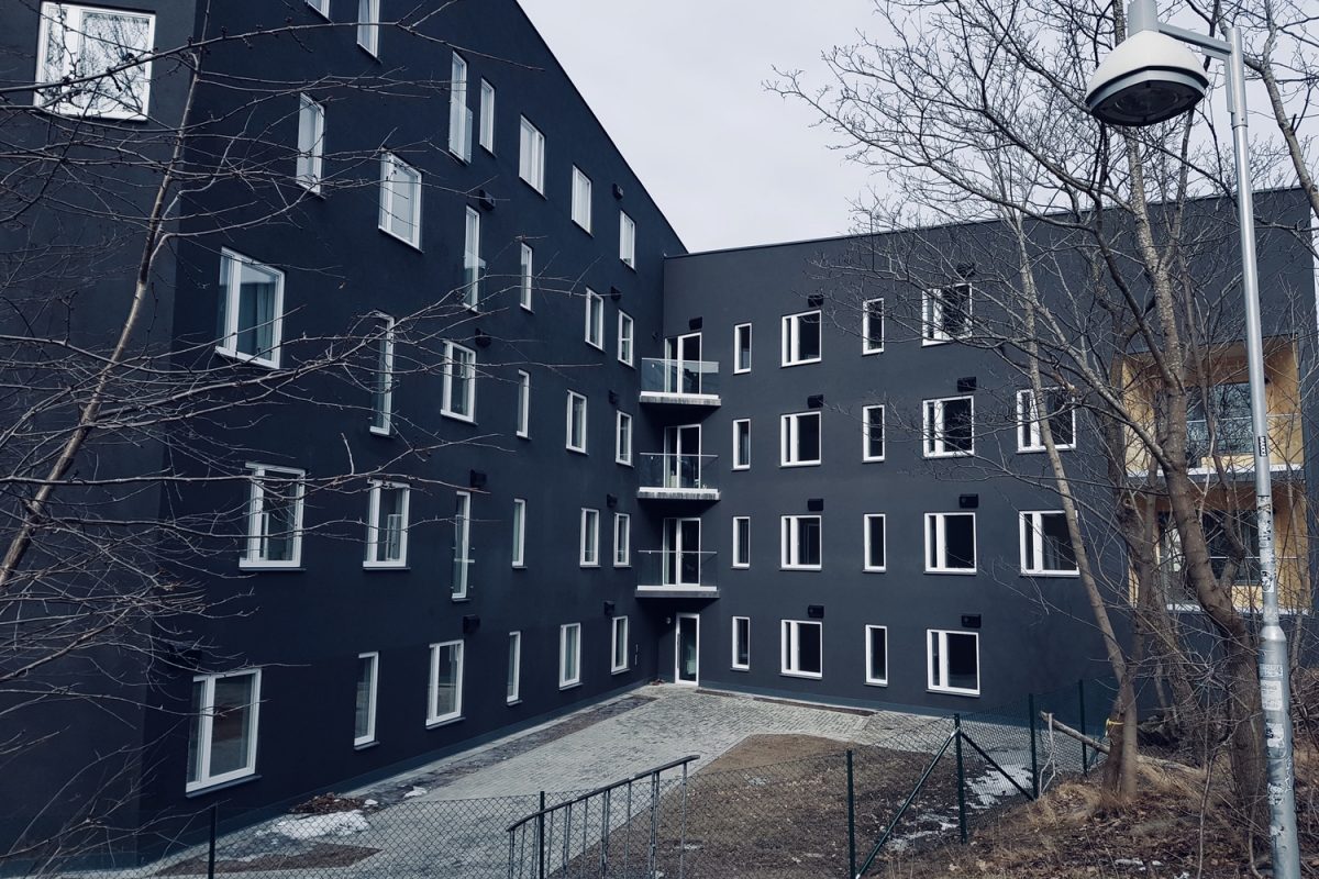 Bostadshus med moderna lägenheter i Stockholm, Sverige. Norrprefab genomförde tillverkningen av träkonstruktioner i ett område på över 4000 m² - ytterväggar och innerväggar.